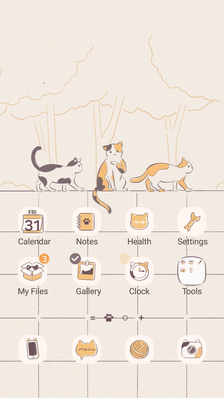 Samsung Themes: ❤️Mun❤️ Cat Stroll ~❤️ Premium Theme three cats walk along a wall with trees softly sketched behind them