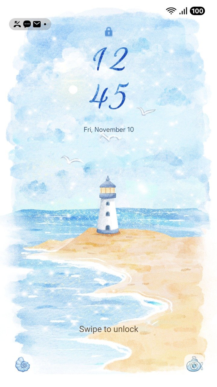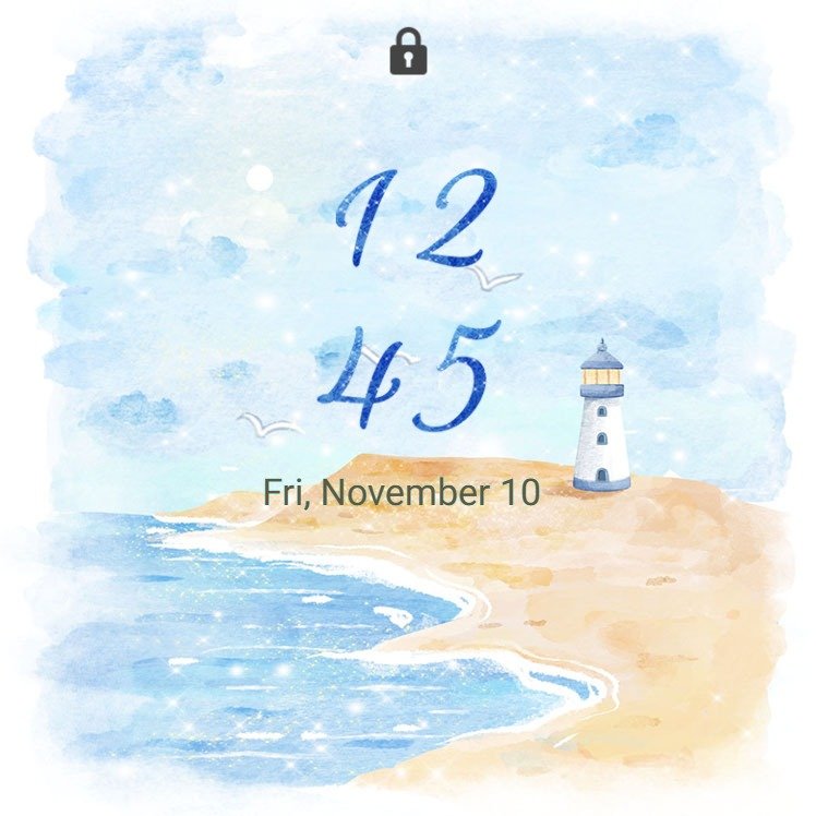 Samsung Themes: ❤️Mun❤️ Dreamy Lighthouse Coast ~❤️ Premium Theme serene watercolor lighthouse by the sparkling blue sea