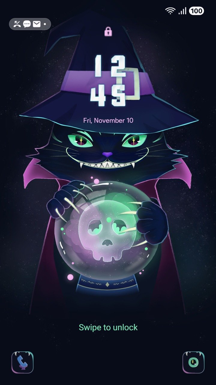 Samsung Themes: ❤️Mun❤️ Mystical Cat Magic ~❤️ Premium Theme black cat with glowing eyes holds a magical skull orb