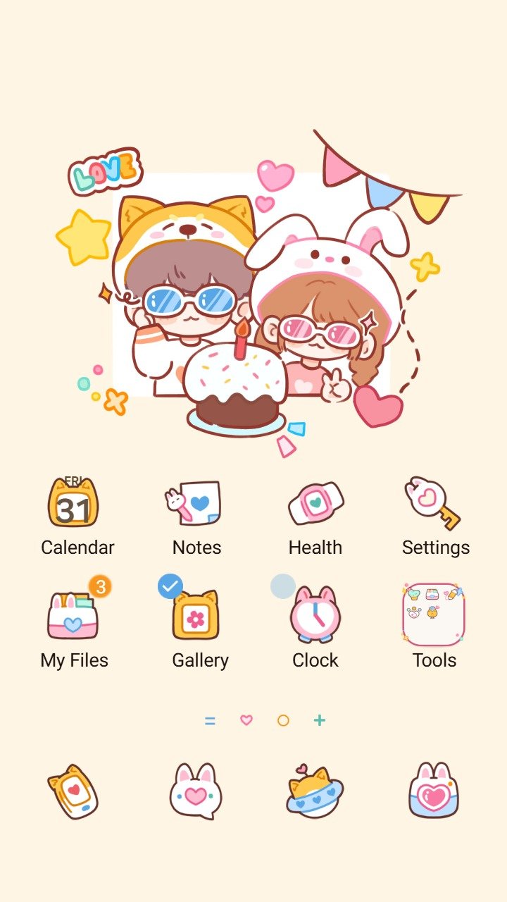 Samsung Themes: ❤️Mun❤️ Party Couple ~❤️ Premium Theme adorable couple celebrating with cake, hearts and playful animal hats