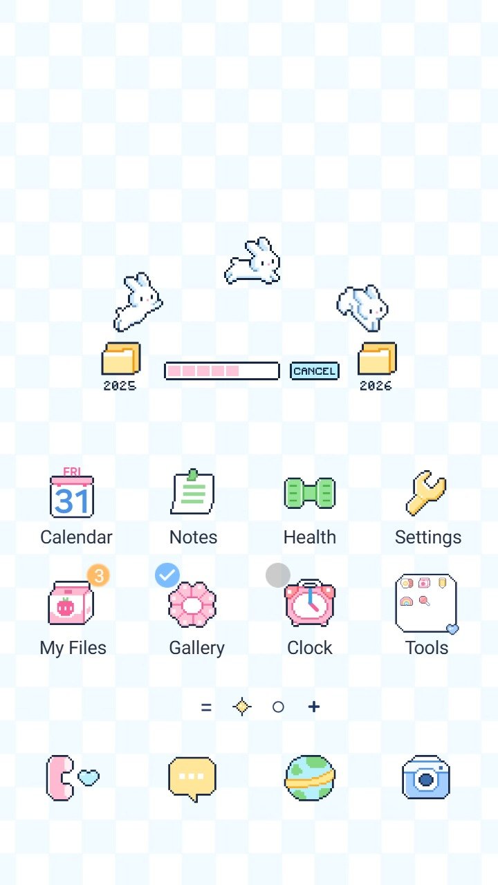 Samsung Themes: ❤️Mun❤️ Pixel Bunnies Transfer Year ~❤️ Premium Theme cute pixel bunnies moving files from 2025 to 2026