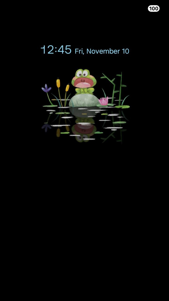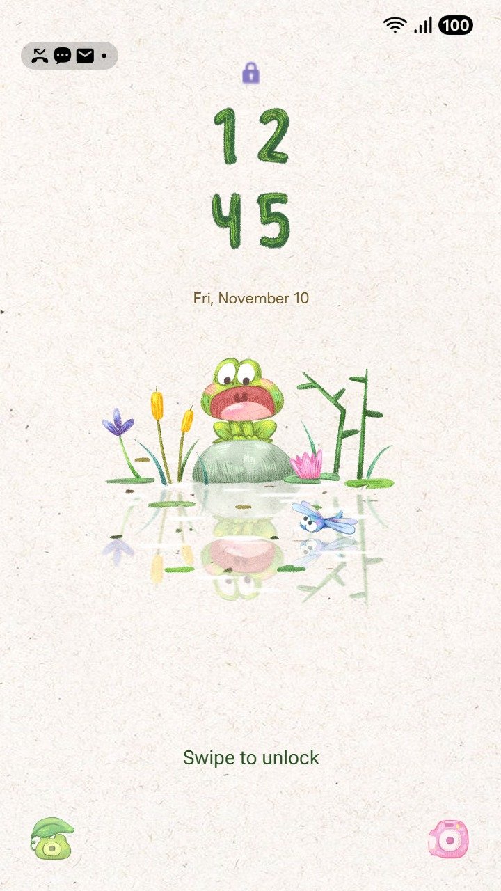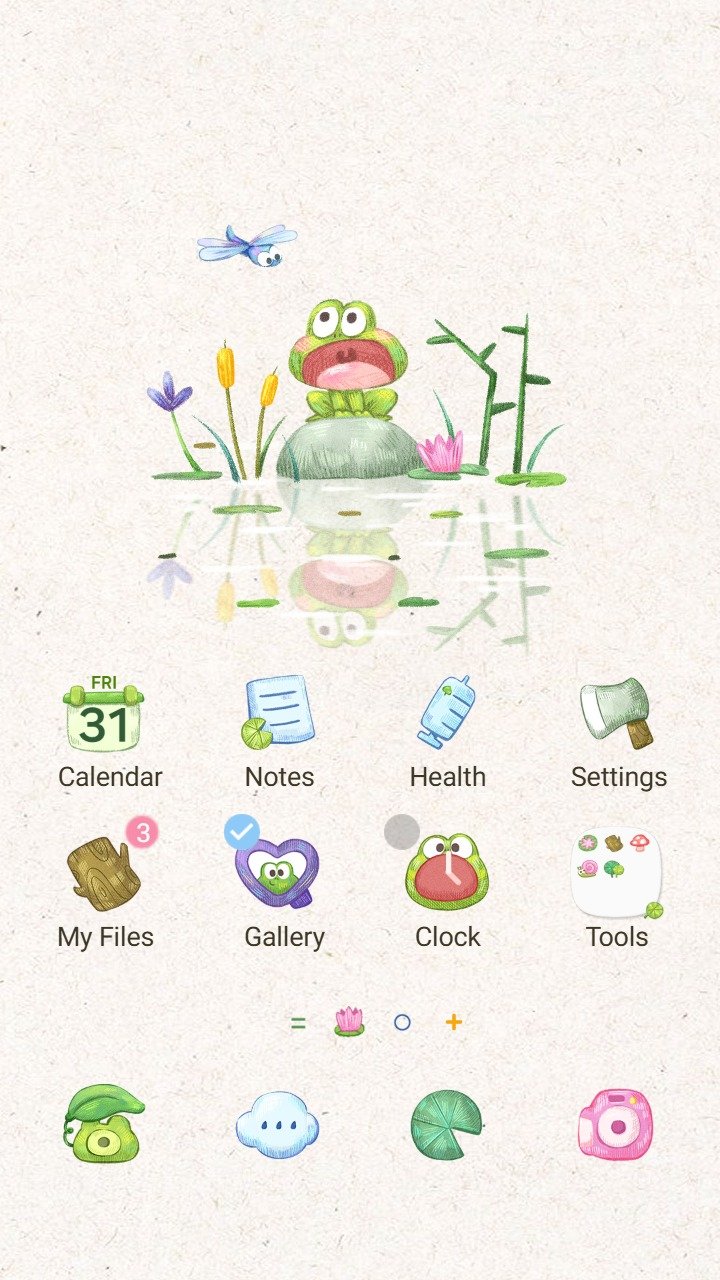 Samsung Themes: ❤️Mun❤️ Pond Frog ~❤️ Premium Theme a cute frog sits peacefully by a pond with tiny flowers and dragonfly
