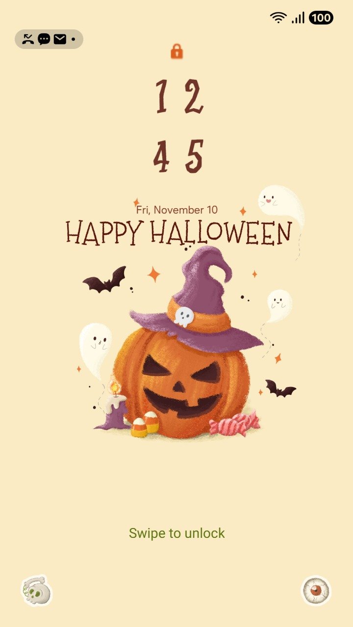 Samsung Themes: ❤️Mun❤️ Pumpkin Ghost ~❤️ Premium Theme a cute ghost pops from a pumpkin with candy and spooky vibes