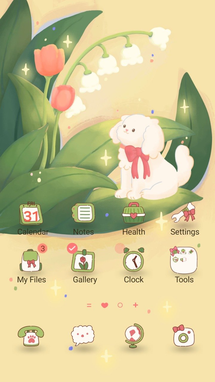 Samsung Themes: ❤️Mun❤️ Sparkling Garden ~❤️ Premium Video Theme a fluffy white dog, surrounded by glowing flowers and sparkles
