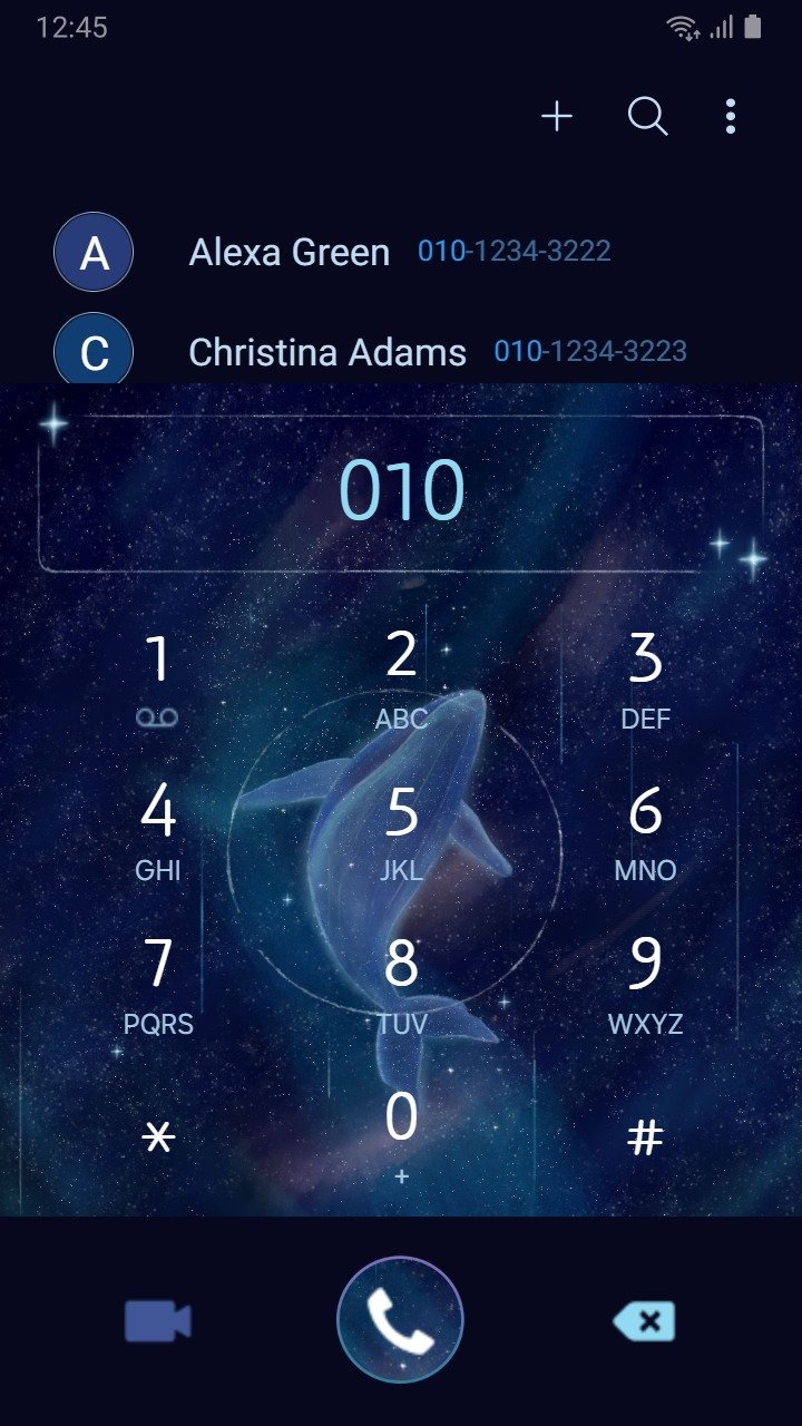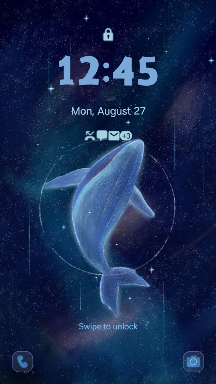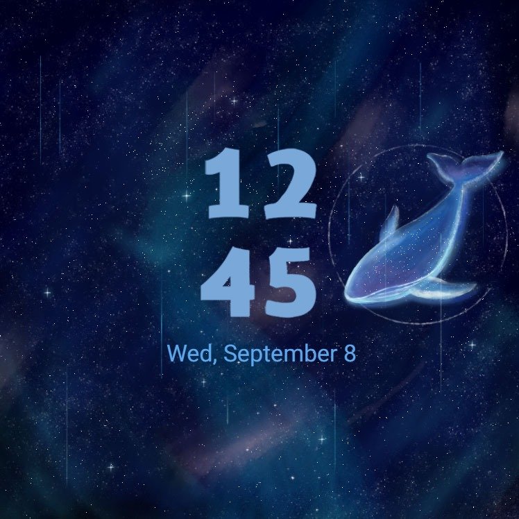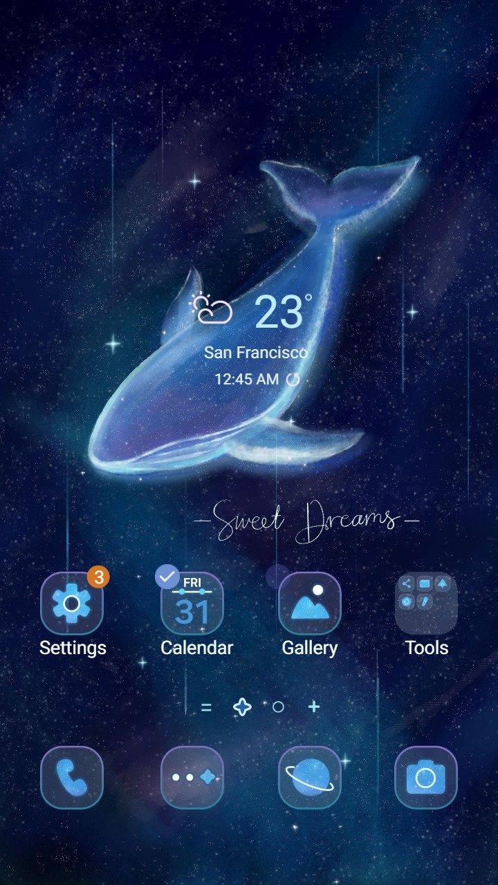 Samsung Themes: ❤️Mun❤️ Sweet Dreams ~❤️ Premium Theme a luminous whale swims through a starry night sky, evoking peaceful dreams